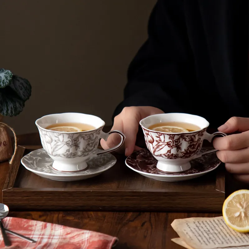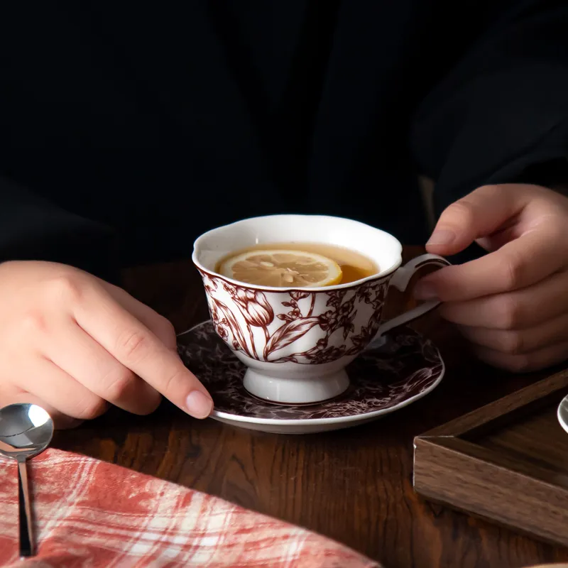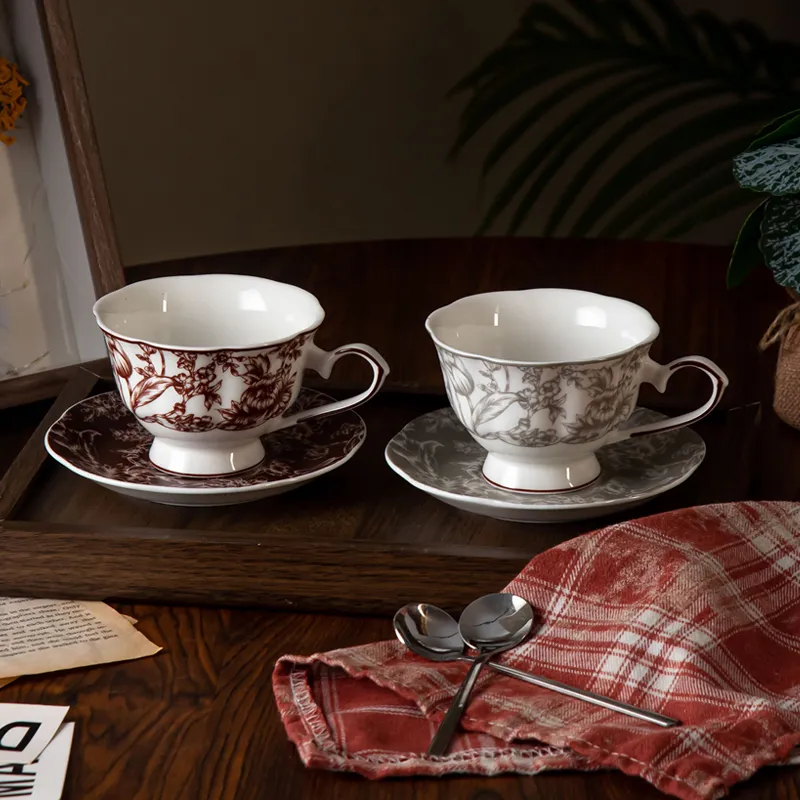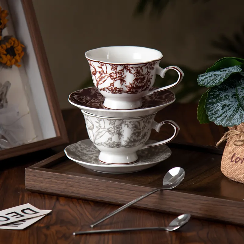 This porcelain coffee cup and saucer set features a classic floral design with a refined vintage aesthetic. Crafted from high-quality porcelain, each cup offers a smooth finish, comfortable handle, and balanced weight for everyday use. Designed as a matching pair, this set is ideal for couples, gift occasions, or elegant home coffee moments. Available with premium gift box packaging, it is well-suited for retail, gifting, and wholesale projects.