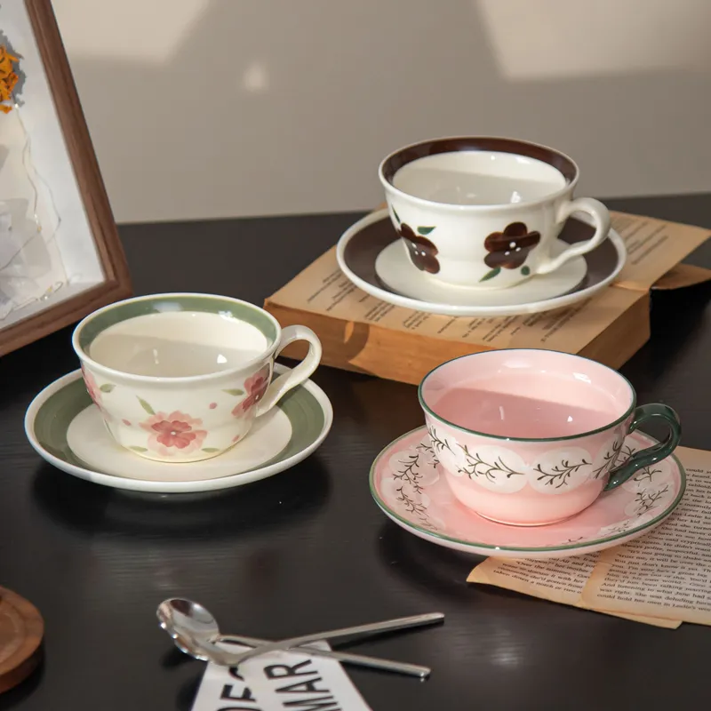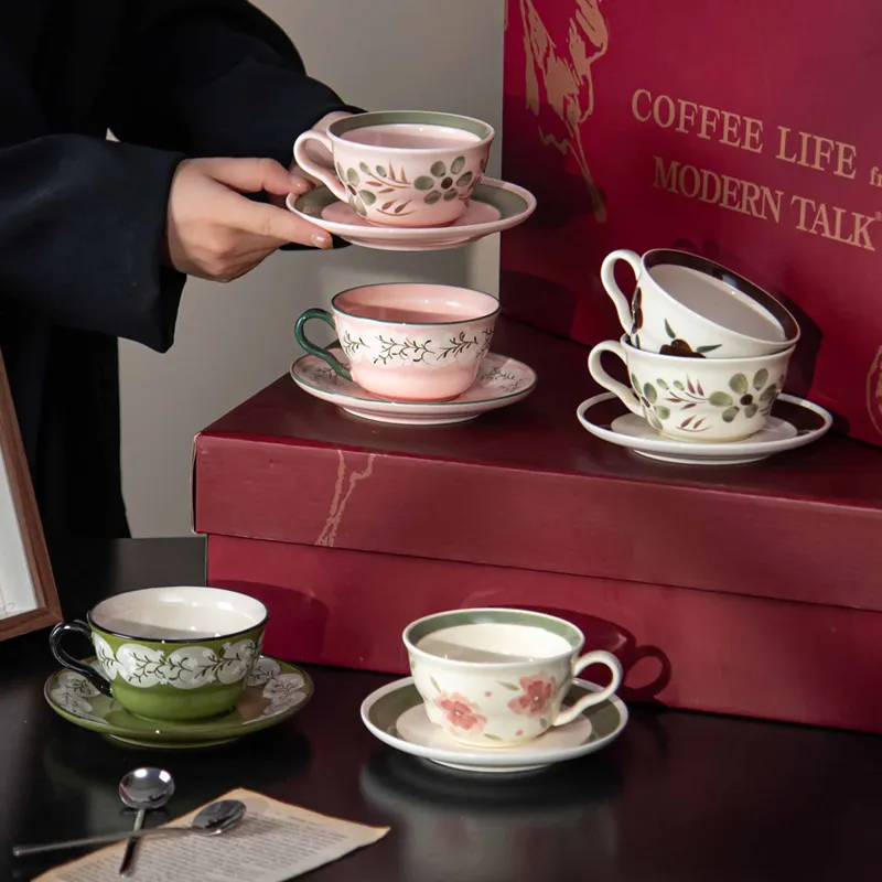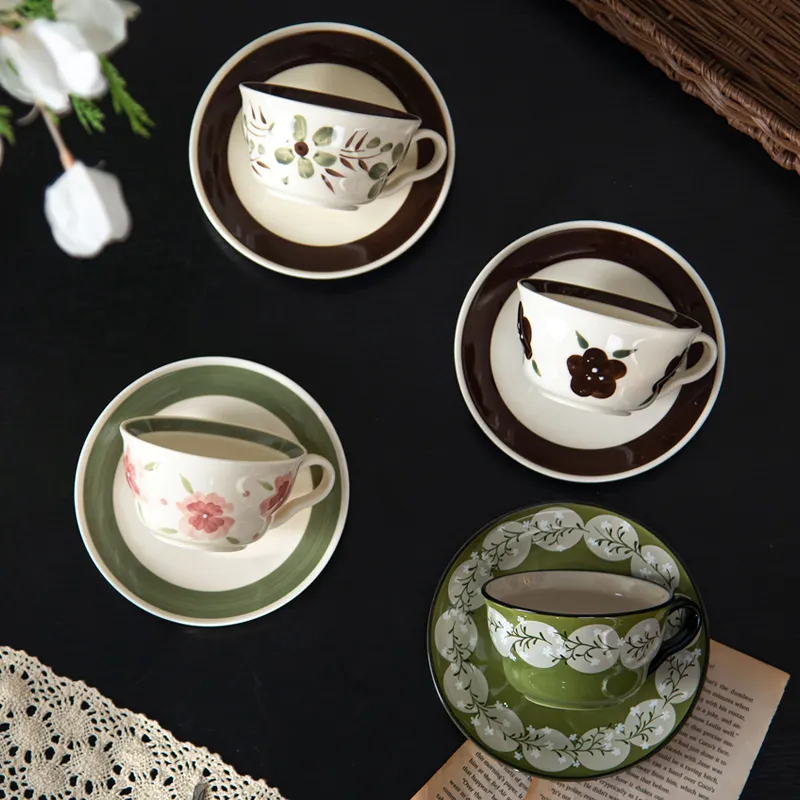 A charming ceramic cup and saucer set featuring hand-painted floral designs, offering a warm vintage aesthetic perfect for coffee, tea, and everyday home enjoyment.
