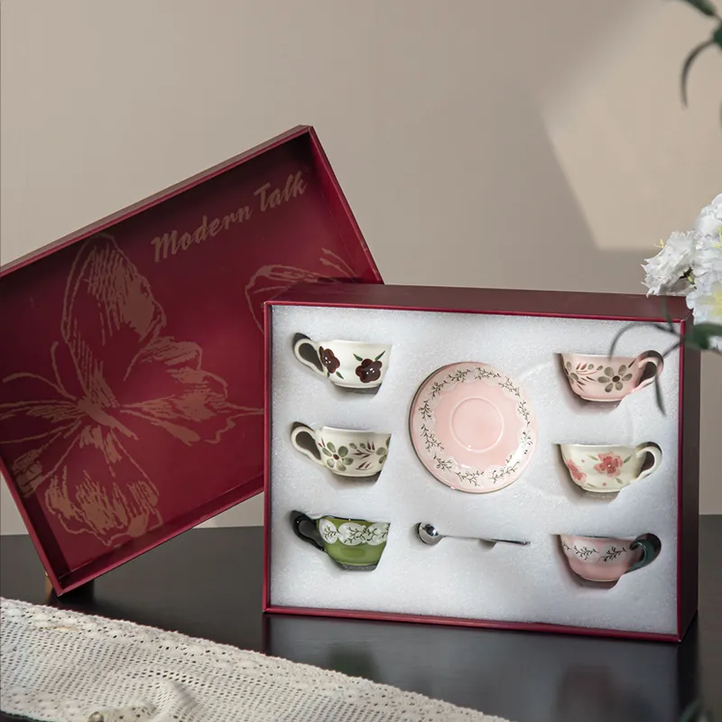 Home > Products > Giftbox Set > Modern Hand-Painted Eco-Friendly Ceramic Tea Cup Set with Saucer and Spoon