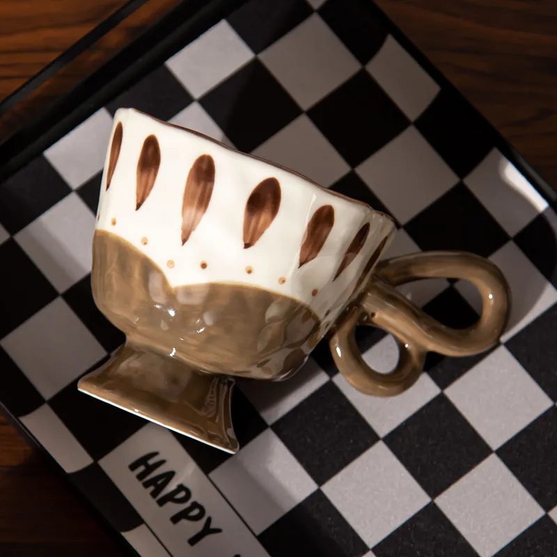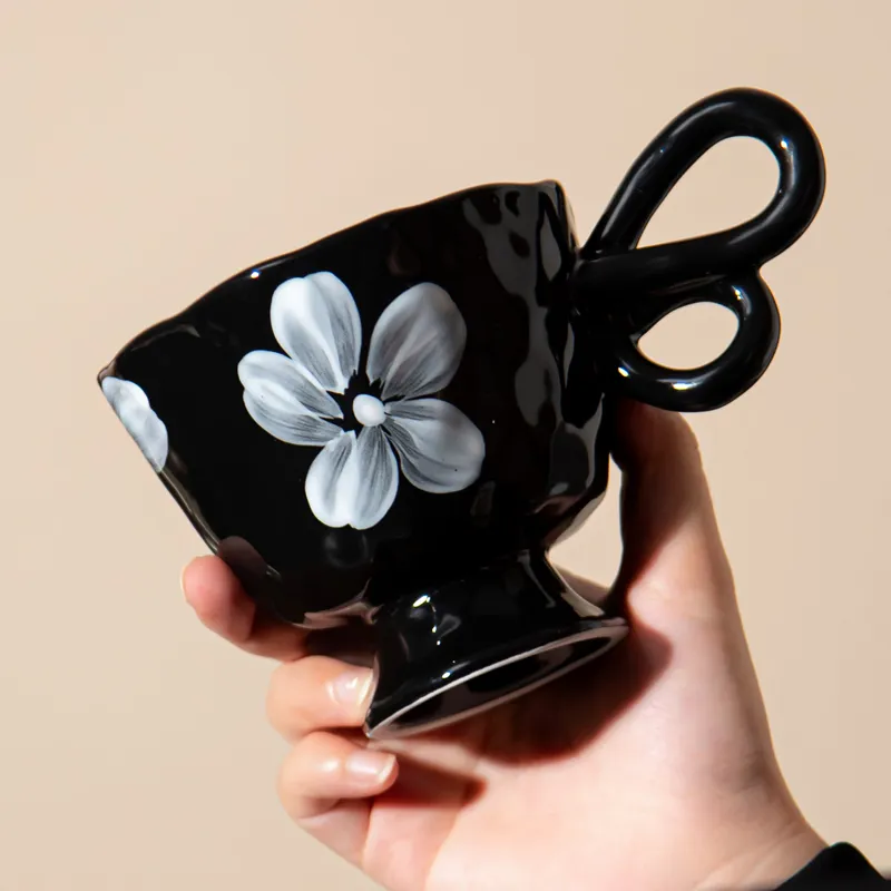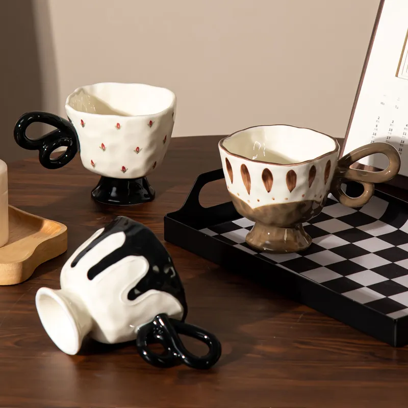 This artistic ceramic mug collection features bold contrast colors, hand-painted details, and unique pedestal bases that give each piece a sculptural, modern look. The creative loop handles add personality while ensuring a comfortable grip. Perfect for coffee, tea, or display, these mugs bring a stylish statement to any home or café setting.