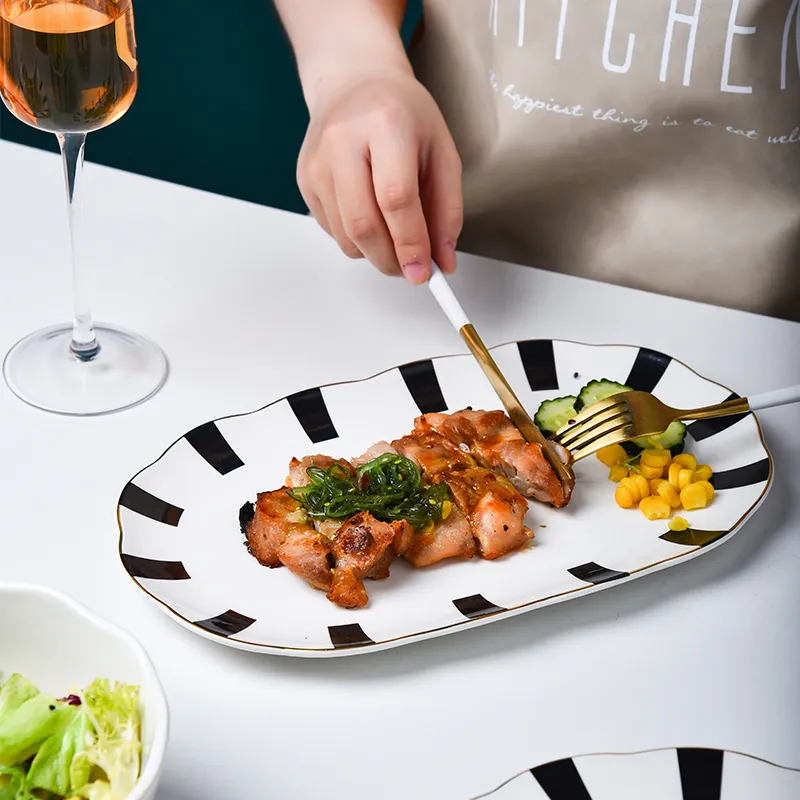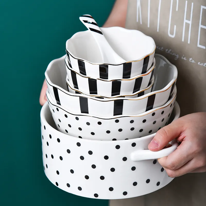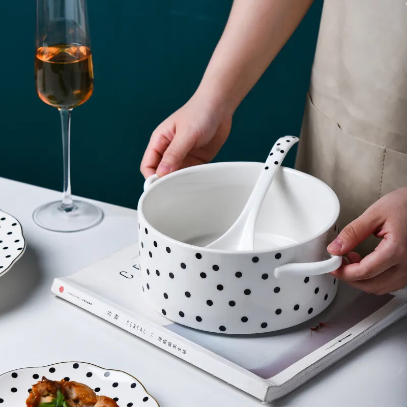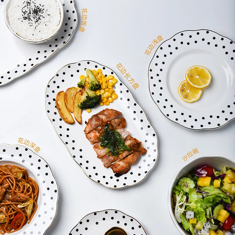 Simple Design Ceramic Tableware Nordic Plate Soup Salad Bowls Spoons Wave Point Geometry Dinner Set