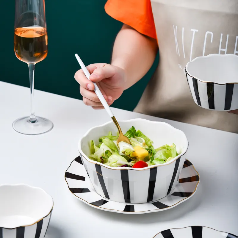Home > Products > Dinner Set > Simple Design Ceramic Tableware Nordic Plate Soup Salad Bowls Spoons Wave Point Geometry Dinner Set